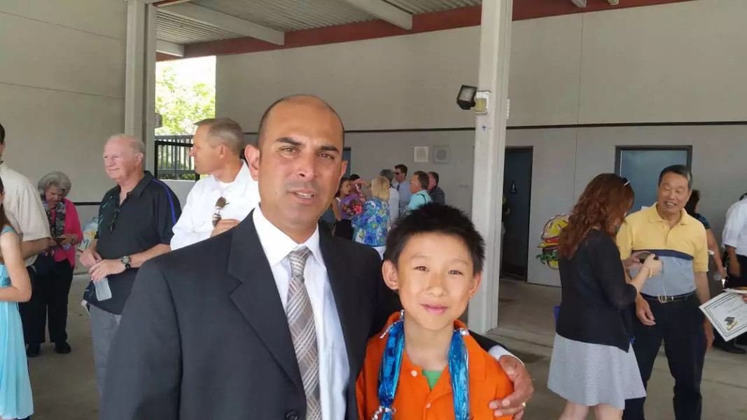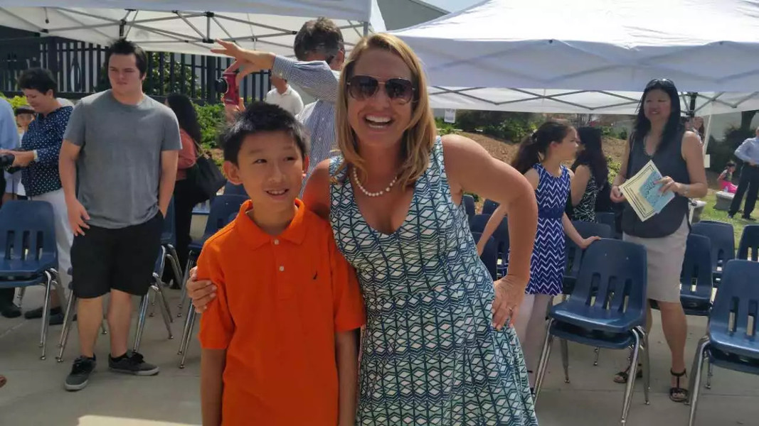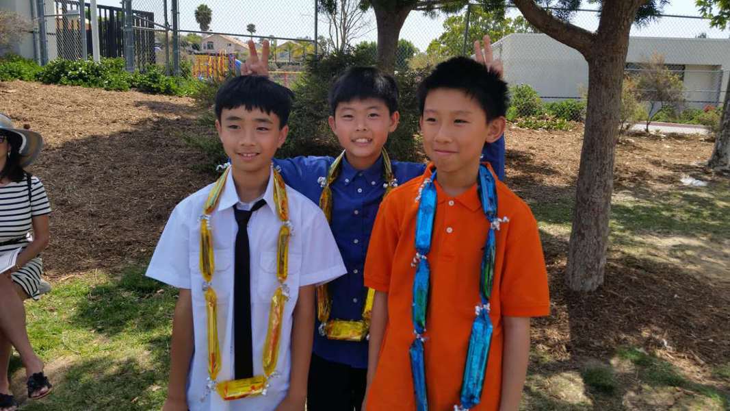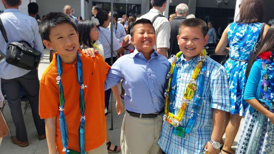 翀翀的发言,博得一次次的掌声、笑声和赞叹声!因为他不乏童趣地感谢着老师的培养,回忆着几次有趣而有益的活动。他感谢老师和校长,把他培养成“科学爱好者,历史警察和‘书虫’”。他幸福地回忆起自己从学前班的Bartlett老师的“小鸡仔”,长成了五年级Marker老师的“大鸡蛋”。他特别强调“尽管先有鸡还是先有蛋的争议,至今无解”,引得台下又是一阵笑声和掌声。幽默的发言,却又在正儿本经的形象语言中结束:“今天,此刻,我们这些企鹅(“企鹅”是Park.Village小学的吉祥物)可以尽情展开羽翼如“飞鹰”(“飞鹰”是即将升入的初中学校的吉祥物)般翱翔了!我们不再追逐那翻腾的浪花,将转而追逐那盘旋而上的气流!”最后的热烈掌声,欢送翀翀走下了主席台。