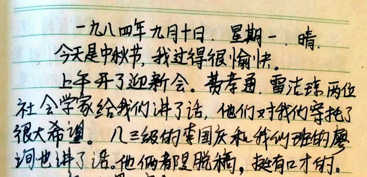 上午开了迎新会。费孝通、雷洁琼两位社会学家给我们讲了话。他们对我们寄托了很大希望....."