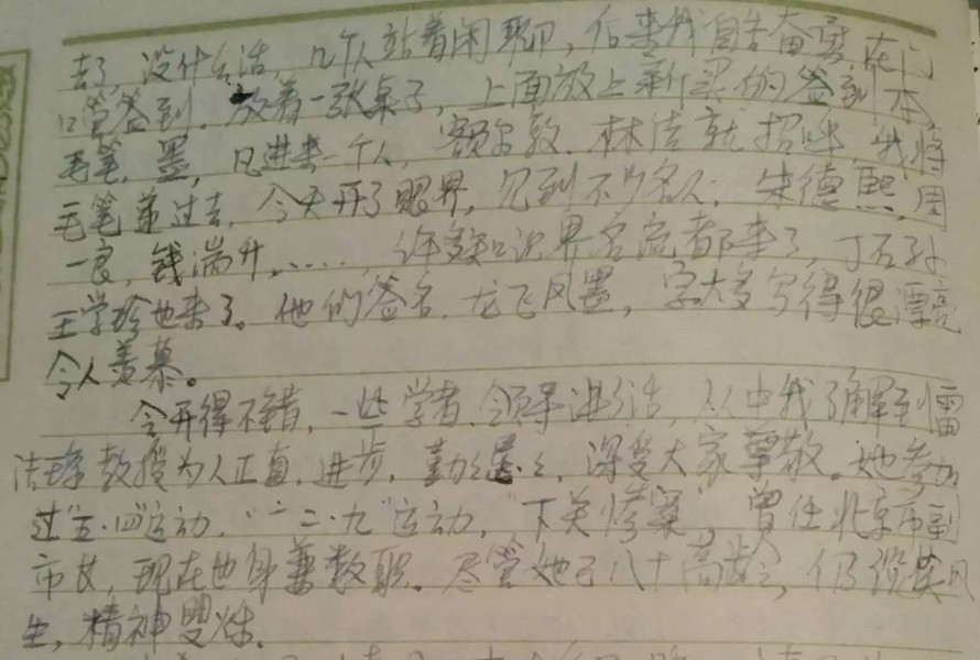 “我自告奋勇在门口签到。放着一张桌子,上面放上新买的签到本、毛笔、墨。凡进来一个人,额尔敦、林洁就招呼,我将毛笔递过去。今天开了眼界,见到不少名人。朱德熙、周一良、钱端升.....,许多知识界的名流都来了。丁石孙、王学珍也来了。他们签名,龙飞凤舞,字大多写的很漂亮,令人羡慕。
