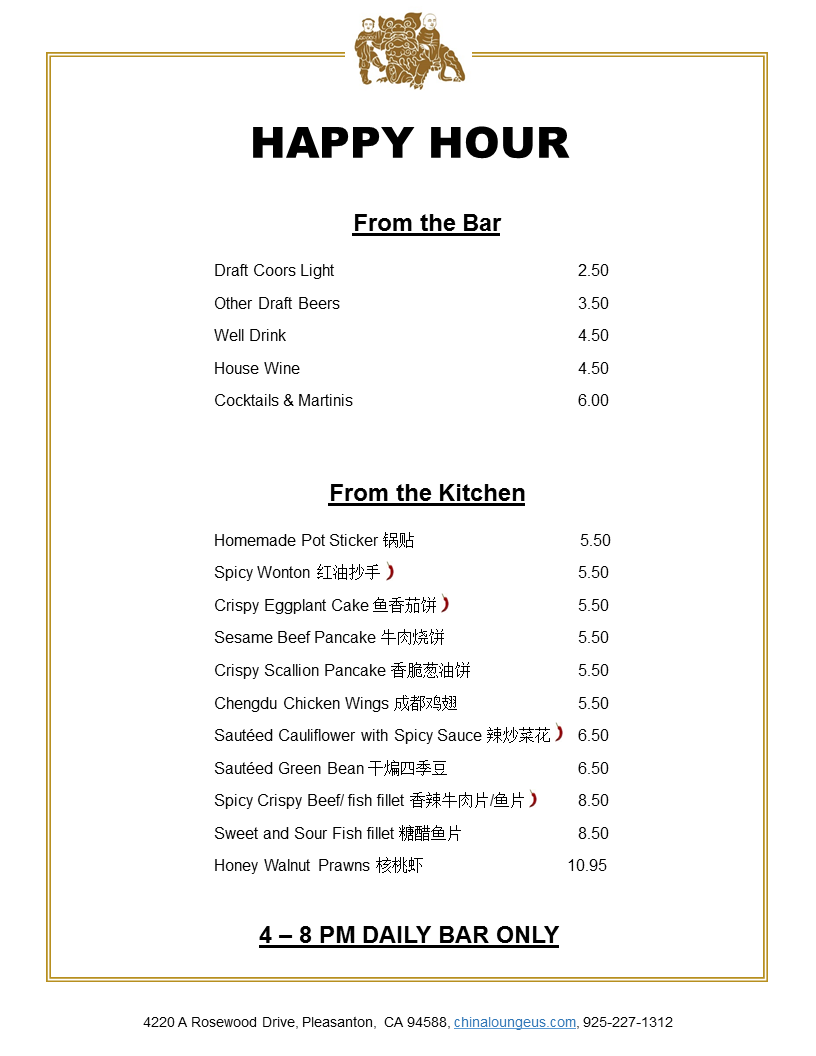 Happy Hour 欢乐时光 🌟Menu 4.0/1 http://www.weidb.co/p19683 获取作者更多文章 Previous Page Next Page 1. Food Menu 菜单 (27742) 2. Lunch Special 午间套餐(16754) 3. Happy Hour 欢乐时光 (17665) 4. Drink Menu 饮料 (17652) 5. Chef's Special 厨师特别推荐(17361) Previous Page Next Page