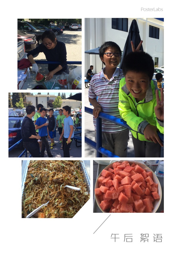 夏令营午餐的安排是一项繁琐而复杂的工作,也是家长们关心的问题之一。俗话说众口难调,有的孩子挑食,有的过敏,有的因事缺席,因此每天都要统计出正确的数字才能保证孩子的午餐供应,负责午餐安排的家长chenxin,yongmei,zhouli,从统计人数到订餐,几乎每天都是在修改中度过,但是她们仍是事无巨细、不厌其烦,几乎满足了每个孩子的不同需求。午餐时间也是室外活动时间,孩子们沐浴阳光,享受美食,有说有笑的嬉闹玩耍,那种欢愉的气氛感染着前去帮忙的每一位自愿者家长,其实这种有张有弛的学习氛围也是家长们希望看到的。忙碌之后,静静地看着一张张愉快攀谈青春洋溢的笑脸,一个个你追我跑的身影,有温馨也是乐趣。