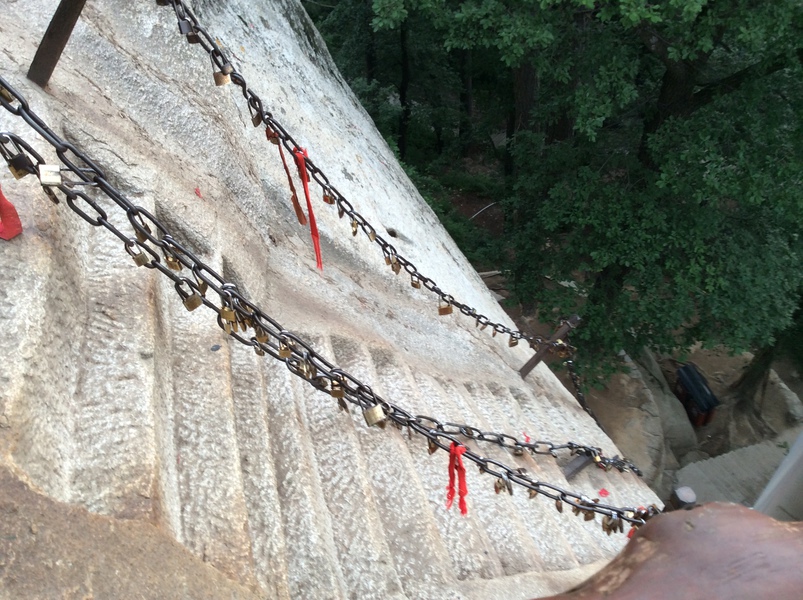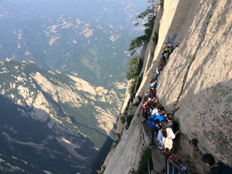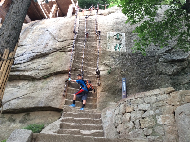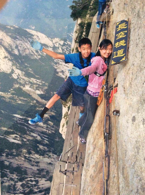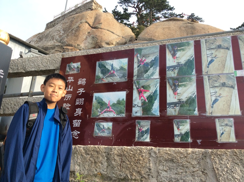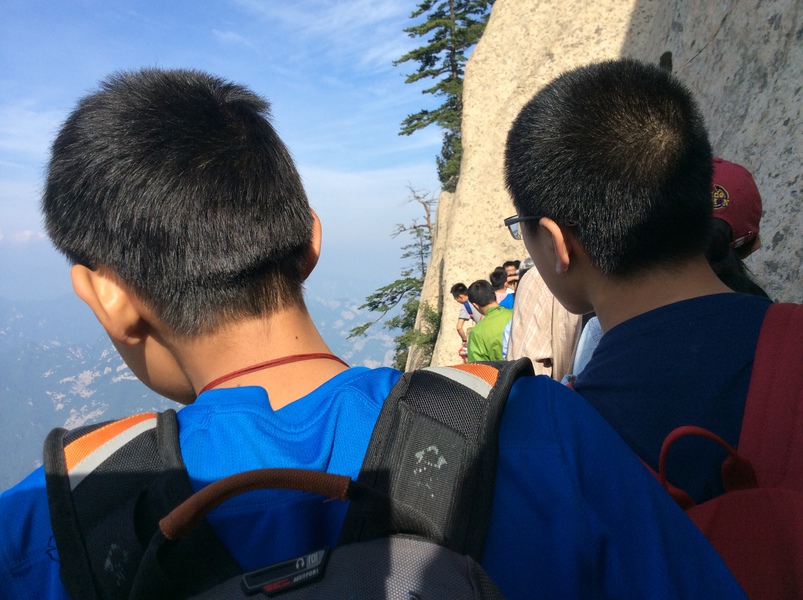 Arnold在山脚下看到华山第一险长空栈道照片说恐高不要去,我这西安话讲的“二杆子”坚持要求看看。我俩说好只是去看看到底什么样。到了那里我说先排队吧,儿子问“Mom, what do we gain from this?" 我也说不出。排队过程中几次想打退堂鼓,Arnold却又不乐意了。估计他既害怕又跃跃欲试。我就只剩害怕了。两个四川年轻人给我鼓劲儿,说“已经到了,就耍一下嘛,也不遗憾。” 结果Arnold又踢腿又往下看。我一直没敢往下看,就贴着石壁一点点挪,还要靠儿子帮我挪绳索。三十厘米窄的木板以及上下几段还要和人交错,我哪里还有害怕的余地?就只能集中所有力量对付眼前难关(summon all my focus on the task one step ahead)。 Arnold说我不敢看悬崖岂非白去了? 回来后朋友发过来介绍,才知道长空栈道被誉为十大惊险悬崖步道。推荐带teens 去体验。 儿子说这回把恐高治好了。照片中鼓励我伸出手的当地摄影师说,能征服这个不就是征服自己吗?