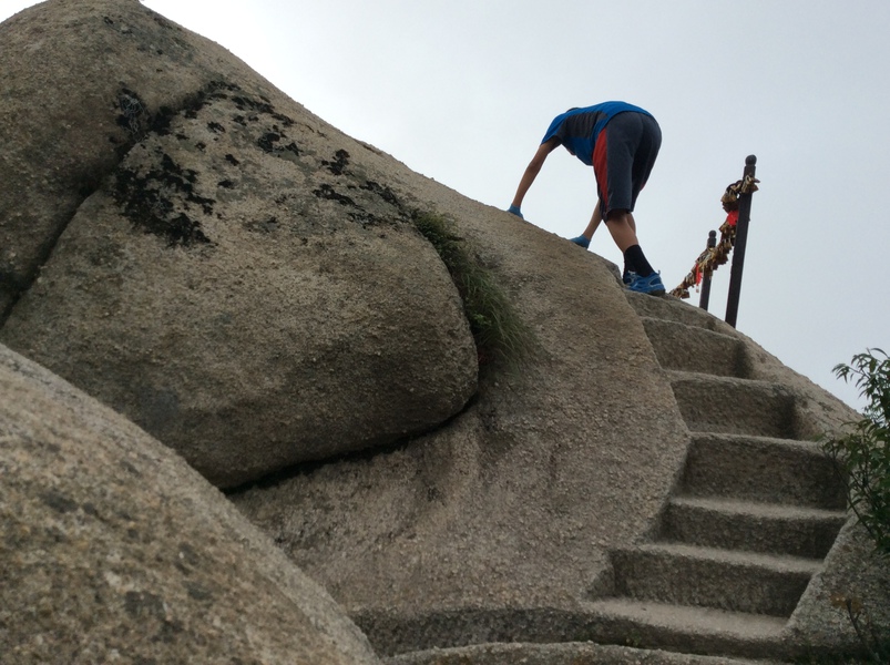 千尺幢惊险、苍龙岭漫长,我一路想着为何弃索道选择徒步七小时!终于到了东风顶旅馆,设施简陋,但已感恩有落脚之处了。太累的缘故和往年相似又摔了大跟头,膝盖脚踝手掌都破了,没法赶去看日出。 早上儿子和我看到鹞子翻身,觉得可怕没敢去,等栈道回来胆子大了很遗憾没去体验鹞子翻身。