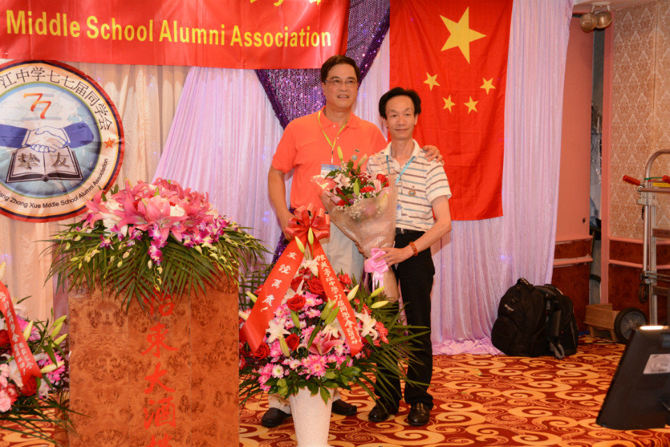 鄭天寿同学代表QQ群群主感言: 尊敬的老师, 总会的领导,亲爱的同学们, 大家晚上好! 今天我在这里代表亭江中学77届的QQ群和微信群的全体同学们, 祝贺今天同学聚会圆满成功, 请允许我代表Q群和微信群的同学们向为本次聚会付出巨大心力的全体成员表示衷心的感谢, 向参加聚会活动的同学们表示热烈的欢迎和真诚的问侯. 亲爱的同学们, 回忆学生时代的往事, 离别了三十八年, 今天又一次相聚, 我觉得这是缘份, 还有是我们之间那份深厚的同学情谊, 还有要感谢网络给了我们一个好的平台, 把我们的同学从四面八方聚集到一起, 天天都可以在Q群和微信群回味那学生时代, 天天都开心快乐. 在这里也特别感谢林少如同学天天守护着Q群和微信群上无私的贡献. 亲爰的老师和同学们, 我们要带著渴望, 带著期盼相聚, 愿大家怀着激情, 拥着热忱重温美好的同窗时代, 祝我们的友谊地久天长, 祝同学会园满成功, 祝大家天天都有一个好心情, 谢谢大家!!!