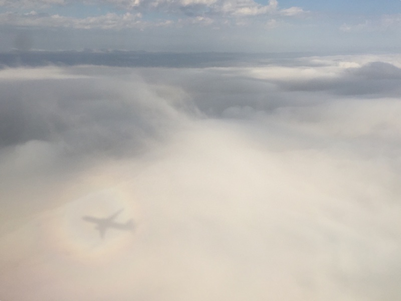 坐飞机,我通常选择窗口的位置,特别喜欢看起飞和降落时的山川秀丽和城市风貌。 那一天,风和日丽,飞机平稳飞行中。我照例抱着iPad,静静地看书,偶尔瞄一眼窗外的云山云海,任思绪随飞机天马行空。突然,窗外出现了些许彩光,渐渐地竟形成了一个彩虹圆圈。“佛光!”似一道闪电掠过脑海,急忙抽出iPhone 6拍下这一幕。
