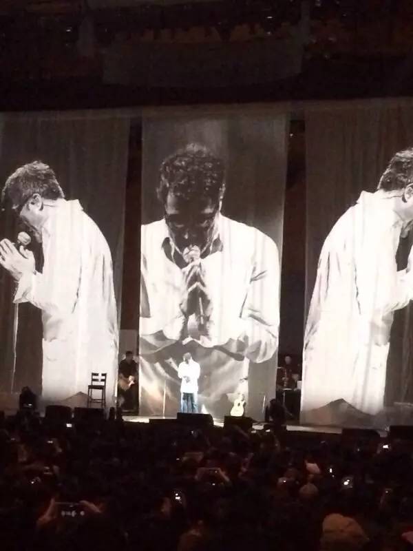 那首“山丘”把演唱会现场推向了高潮。三大块黑白效果幕布眏上他谦卑的身影。这首去年的新歌,据说写了十年。他想用音乐沟通自己的人生经历,充满着沧桑,无奈和遗憾,和回首往事诸多未完成的心愿。一举击中人心,不禁又被感动的泪流满面。这样的一个男人,用他的一生来书写一个音乐人的传奇。57岁的年龄,在将近三个小时的时间,实打实的唱歌,没有舞群,没有升降台。就是靠那些歌,把台下的观众感动,没有隔空对唱的悲情戏码,更没有令人期待的女嘉宾,只是用他的个人魅力和谦恭的态度还有美妙的歌声征服了在场所有的歌迷。包括他偶尔的口吃都很使人感动。真真正正的实力派。