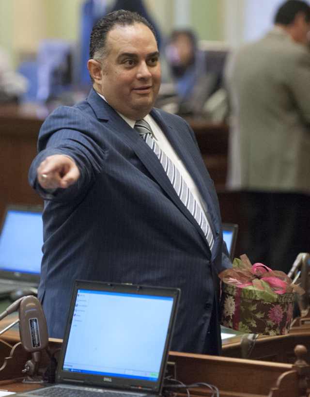 PHOTO: : Assembly Speaker John A. Pérez, D-Los Angeles points to the desk of Assemblywoman Nora Campos, D-San Jose before legislators are sworn in during the first day of session at the State Capitol in Sacramento, Calif. on Monday, Dec. 3, 2012 . The Sacramento Bee/Hector Amezcua