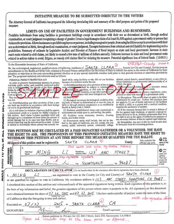 并欢迎给他们捐款。他们的提案 “PERSONAL PRIVACY PROTECTION ACT”, 要求在所有政府建筑中包括中小学校,人们必须根据他们的真实生理性别选择公共厕所等设施,从而间接废除AB1266公用设施相关条款。只有在2015年11月20日前收集到36万多份注册选民的有效实体签名表格(推翻法案的正式签名不能用网签),这项提案才能被放入2016年大选选票上,让全民公投来决定厕所法案的去留。鉴于很多填表内容因为不够清晰,或者签名看起来与voter registration卡上面有区别,所以会出现很多废表,所以目标是收集50万表格。