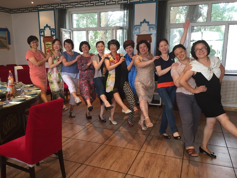 第二天孙冀安排的烤全羊是最别开生面,也是最精彩的,是这次聚会的高潮。开餐前同学们拍照的情景热闹非常,十四个女生脱离了少女的矜持,更加泼辣任性,几个男生被我们任意摆布,各种造型,各种姿势尽情地照,直到开席。