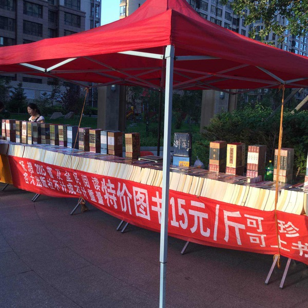 我惊奇地发现院子中央居然有一个大书摊儿,一条长长的桌子上摆放着各种书籍,大多是精装的,成套的书,有《二十五史》,《四书五经》,《史记》,《资治通鉴》等等。原来这是一家出版社在促销,一条横幅上书:特价图书15元/斤。论斤卖书,而且是新书,这让我不禁哑然失笑。记得以前论斤卖过旧书,。论斤卖书真是个创举,闻所未闻,可能在全世界也绝无仅有。当前中国物价上涨,唯有知识贬值。如果先贤们地下有知,看到他们的文字被称斤论两,不知他们会做何感想,司马千和司马光说不定会气得从坟墓里冲出来砸称。
