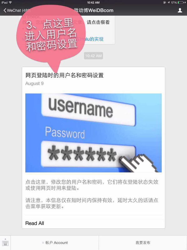 如何在WeiDB上设置用户名和密码微动博WeiDBcom 08/09 9222 4.0/1 相关链接手把手教程:http://www.weidb.com/p17591用户名和密码设置:http://www.weidb.com/p23094修改文章?请看:http://www.weidb.com/p23036用户名和密码的设置只要你加了微动博(微信号:WeiDBcom)为好友,便可以在和它的聊天窗口下设置你的用户名和密码。将来电脑上也可以访问www.weidb.com,发布您的信息。首先,点击这里加微动博微信号为好友(follow或者订阅)。然后,你就进入了和微动博的聊天窗口。再然后呢,就可以通过和微动博聊天窗口的菜单,设置用户名和密码了。请看下面两张图的图示。以后你要是忘记了用户名和密码,重新进来设置一下就可以了。平时你在微信下面要用微动博,咋办呢?找不到啊。最后一张图告诉你怎么找到它 :) http://www.weidb.co/p23094 上一页 下一页 51. 国民党自取灭亡(8048) 52. 海外观众:9月3日大阅兵现场视频直播!和祖国同步感受震撼!70th Anniversary end of World War II Victory Day parade, exclusive worldwide broadcast(41237) 53. 编辑模板汇总(10906) 54. 留住曆史 鎖住罪惡 紀念抗戰勝利70周年(30749) 55. CivilRights微信记录的xc(8238) 56. H1b下岗后常见身份问题解答(11934) 57. Counting From Infinity - Yitang Zhang and the Twin Prime Conjecture(9086) 58. CivilRights天津大爆炸海外捐款渠道开通,欢迎诸位奉献爱心,多少不限(8559) 59. 天津爆炸案现场累计存放危险化学品3000吨左右(9464) 60. 天津爆炸事故造成114人死亡 已有101人确认身份(9297) 61. Event lecture(76948) 62. 天津港爆炸点3公里内人员被紧急疏散(8840) 63. 消防员口述救火遇爆炸始末:5分钟后领导说情况不对(9386) 64. 在WeiDB.com上增加表格(8878) 65. 修改WeiDB.com的文章(10513) 66. 如何在WeiDB上设置用户名和密码(9222) 67. 皮皮蝦:【有多少爱可以重来-兼论逆商(AQ)】(9489) 68. 六四绿卡占名额 中国移民恐还债百年(11305) 69. 诚邀成为微动博的股东(60804) 70. CivilRights需要您的支持,请“众筹”,伸出您的援手!(64222) 71. 从人口比例看,美国的堕落和衰落是一个不可逆的进程 (转载)(7166) 72. Members of CAPAC Urge Support for Transparency, Opportunity for All, and Diversity in the Higher Education Admissions Process(7504) 73. Contact US(36090) 74. 大纽约地区活动汇总(67464) 75. 温哥华活动总汇(65130) 76. 南加州活动总汇(68159) 77. 北美华人各地活动总汇(11745) 78. 多伦多活动总汇(63559) 79. 湾区活动总汇(69934) 80. 加州帅气华男涉嫌绑架流浪女子遭控5项罪名 友人:他一定被坑了(7869) 81. 佛罗里达活动总汇(63609) 82. 休斯顿活动汇总(64298) 83. 波士顿活动汇总(65951) 84. 被9所大学不公平拒绝 亚裔学生向教育部愤递申诉(13581) 85. 胜败系于一人 得州大学招生案重返高院或解华裔困境(6604) 86. 胜败系于一人 得州大学招生案重返高院或解华裔困境(6682) 87. Introduction of the Organizing Committee of the Administrative Complaint against Harvard University(21985) 88. 手把手教你如何利用微动博发布信息(33882) 89. On Health(73131) 90. CivilRights 众筹 顾问委员会(61093) 91. 受到藤校歧视的亚裔学生,请不要沉默下去!(10380) 92. 受到藤校歧视的亚裔学生,请不要沉默下去!(8545) 93. 团队介绍(10017) 94. 美国亚裔申诉哈佛组委会决定将扩大申诉范围(17333) 95. Asian American Coalition Determined to Expand the Complaint against Harvard(15211) 96. 90后李林笛宣布参选宾州国会众议员(9270) 97. BC省家长应该知道的秘密协议:同性恋者是怎样掌握课程修改大权的?(10043) 98. The U.S.-China Strategic & Economic Dialogue / Consultation on People-to-People Exchange(21098) 99. 劉磊珍藏抗戰文物 國會展出(6077) 100. Rep. Royce and Colleagues Send Letter to Federal Government on Asian American Complaint Against Harvard University(18544) 上一页 下一页