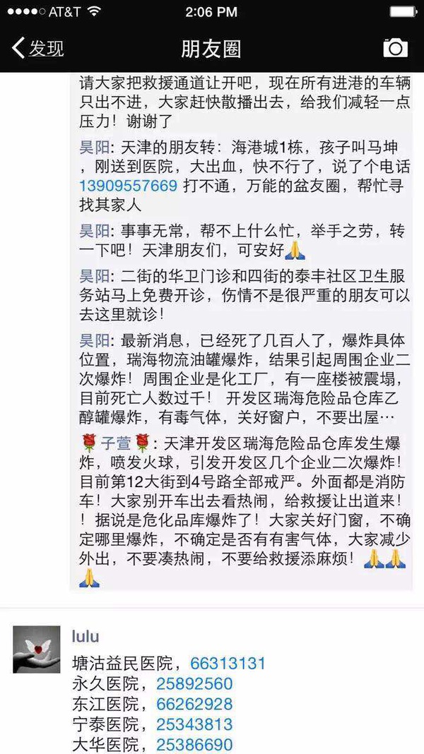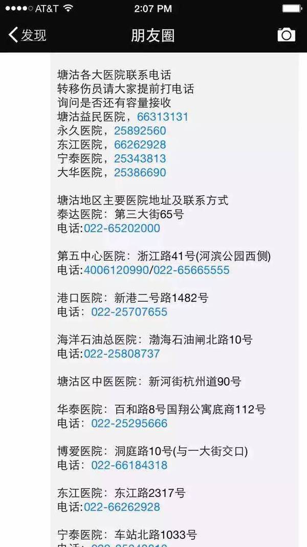 转!重要通知!!!大家注意!!!爆炸中,烧伤和外伤的,别往五中心挤,直接到东江医院来!烧伤科已准备好抢救!请相互转告!/:@)/:@)/:@)(塘沽,泰达,港口都满了,据说海洋医院也有不少人) 塘沽益民医院,66313131