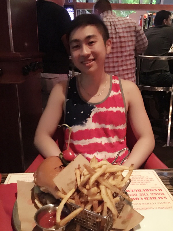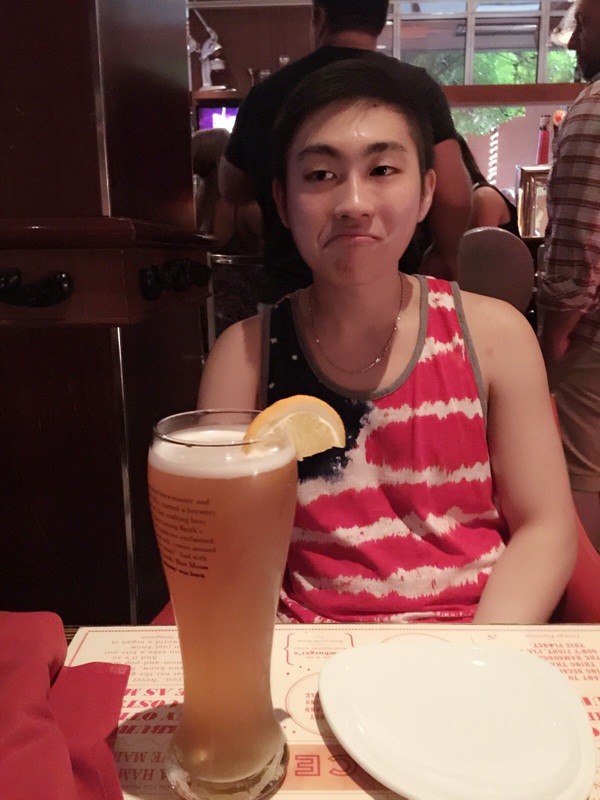 到了晚上,他缠着我要去酒吧长见识,我就带他去了。正好是星期五,美国的酒吧文化是周末特别热闹,而且开始的非常晚,大概十点以后才陆续上人。美国的法律是:18岁可以结婚,但是21岁才可以喝酒,酒吧他进不去,不够年龄,只好到附近找了家饭店吃饭,看看这张照片,看着啤酒也不能喝的噘嘴的样子。好笑哟。开心。