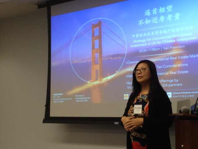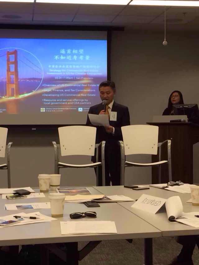 昨天下午,中資企業在美商務地產研討會在舊金山舉行。舊金山市區Deloitte德勤公司大樓裡,中國企業家協會,中領館主辦了爲中國投資人服務的商業地產研討會,李真真參與並主持了這一勝會。會議比較關注的內容是,中資企業在美投資商業地產的狀況與分析,現場有部份專家提供法律,商務,稅務等諮詢。中企單位及部份當地一些投資者出席了研討會。