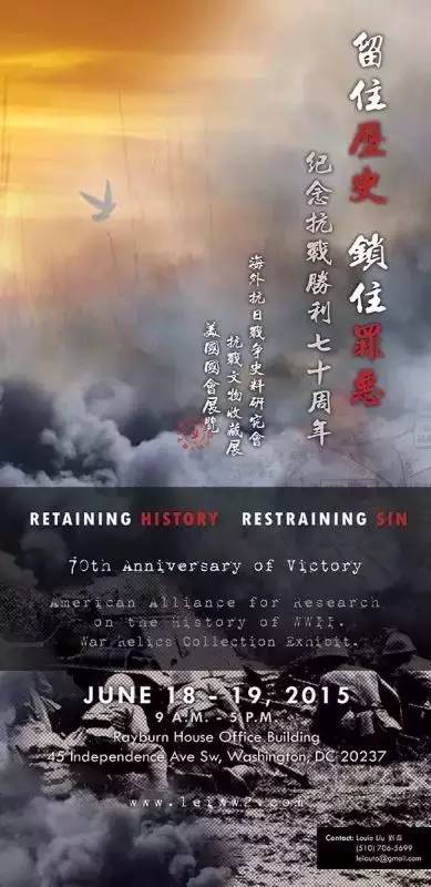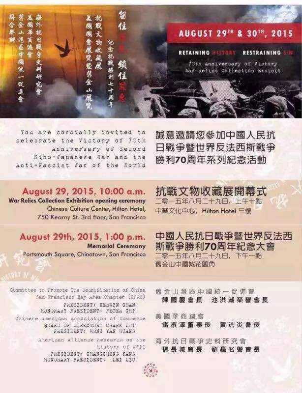 海外抗日战争史料研究会和华商总会在8/29,8/30两天,举办抗日战争史料展览!旧金山湾区各界华人将聚集在中国城花园角公园一起举办中国人民抗日战争胜利暨反法西斯战争胜利70周年系列活动,诚意邀请各位参加!