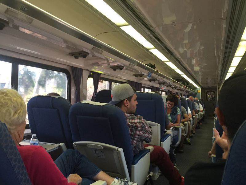 由于马场距离我住的地方很有些距离,我决定乘火车前往。Surfliner火车宽敞舒适,沿途是漂亮的海景。车上很多人都是去看赛马的,男士们大多穿着夏威夷式的花衬衫和百慕大短裤。女士们穿着各色sun dress,高跟鞋,配上精致的遮阳帽,很是赏心悦目。人们热情的互相问候,我隐约听见好几群人的谈话里都提到他们是来参加公司在马场举办的聚会。看来,马场是公司聚会的热门地点呢。
