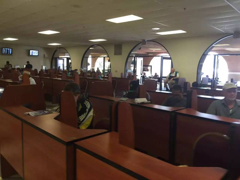 马场里面很大,有各种设施。除了普通看台,马场里还有餐吧,人们可以一边喝着啤酒吃着汉堡,一边给马儿们加油。不想晒太阳的人也可以在马场看台后面的酒吧里面看电视直播。甚至马场里面还有类似单人办公桌似的设置,看上去应该是给职业赌马人士准备的。