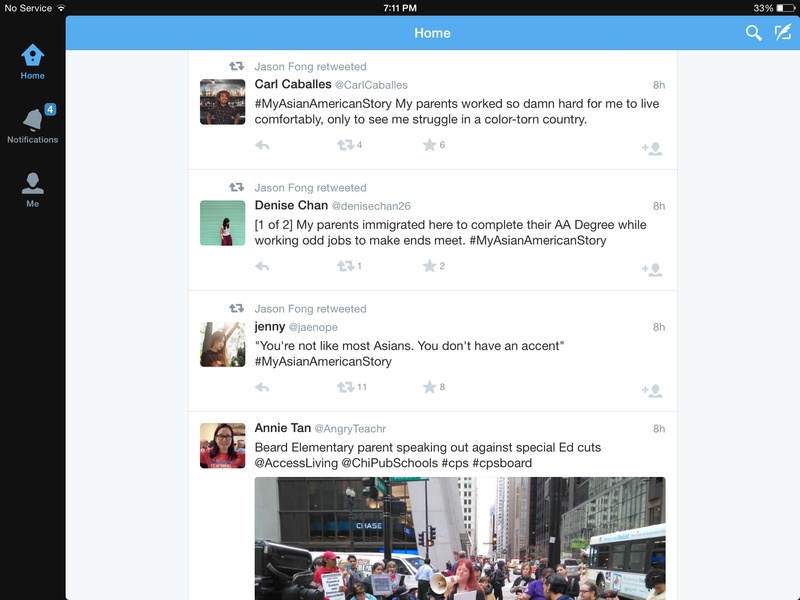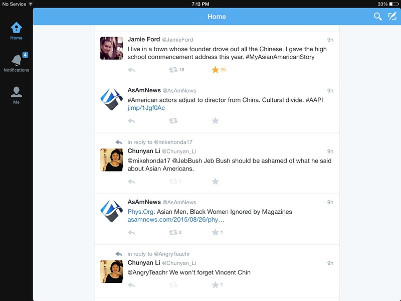 在各种微信群如雨后春笋般疯长之际,说大家离开微信未免疯狂了吧?昨晚刚在实践群提到大家应该到Facebook and Twitter 上发表观点,早上看到15岁学生针对Jeb Bush Anchor Baby comment 而发起MyAsianAmericanStory 的hashtag,马上在Twitter上开户发言,并follow了几位: Jeff Yang, 曾写Asians are robots, 也反对哈佛诉讼;Annie Tan, niece of Vincent Chin; Mike Honda, 日裔议员;Jamie Ford, 畅销书作家, Hotel on the Corner of Bitter and Sweet (从一位华人青年角度讲述二战日裔美国人经历)。这样一些人物,不论他们观点如何,是我们平日能在微信群中看到的吗?