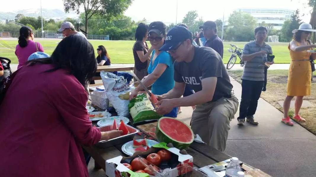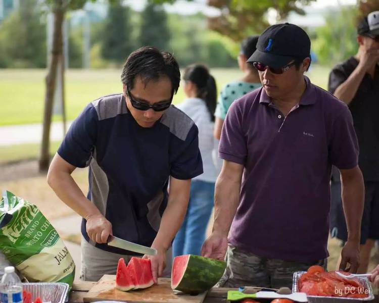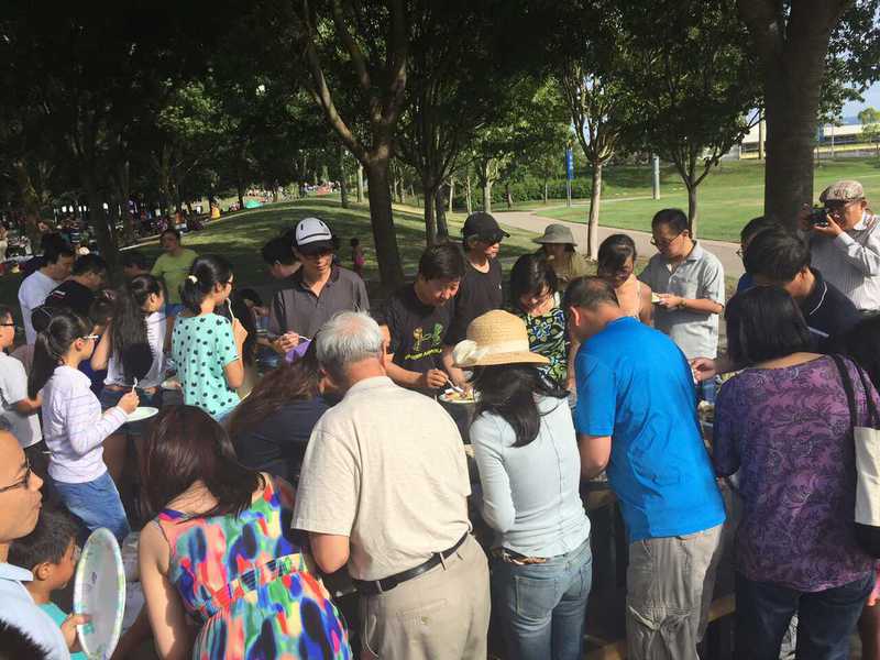 CACC特意准备了各种烧烤食品,包括三文鱼饼,香肠, 牛肉饼,还有西瓜, 面包,水和许多零食等. 参加活动的新老朋友们有将近200人,他们扶老携幼,带来了精心制作的各种美食, 香味扑鼻而来,令人胃口大开.