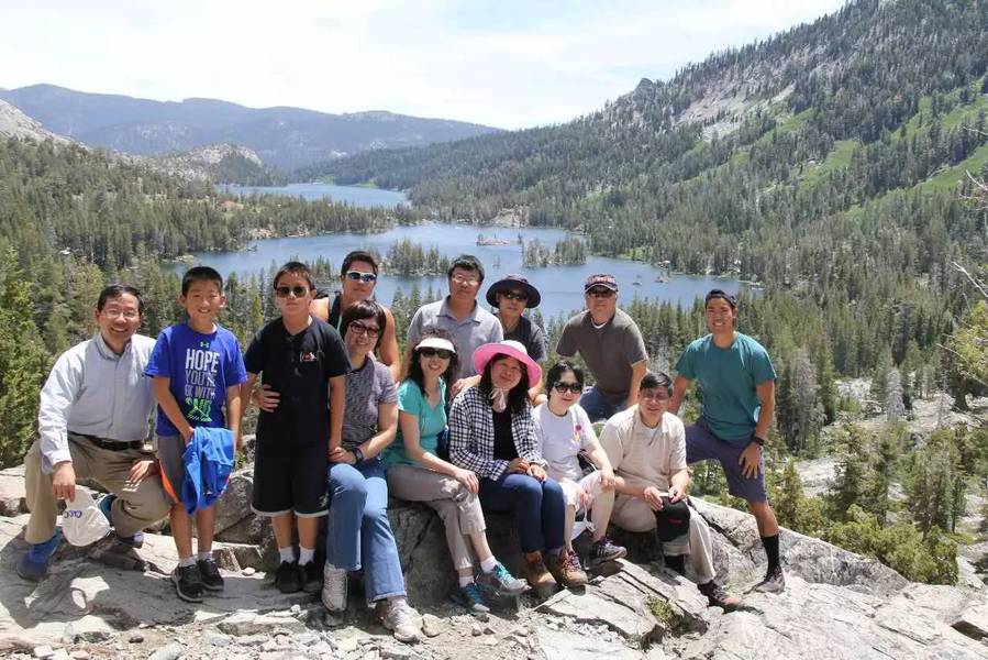 Echo lake景色优美,大家登山两英里,爬到附近的山顶来一张合影,留下美好的纪念.