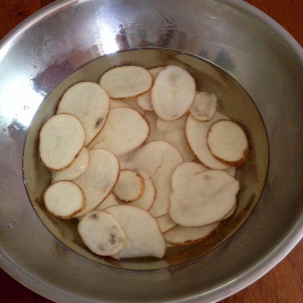 弟弟自己切的土豆片,泡在白醋里为做炸土豆片备用