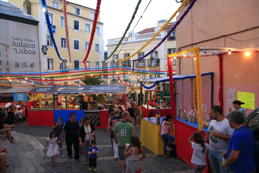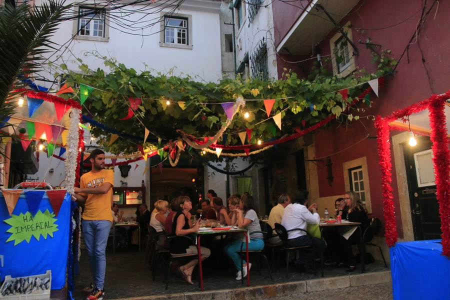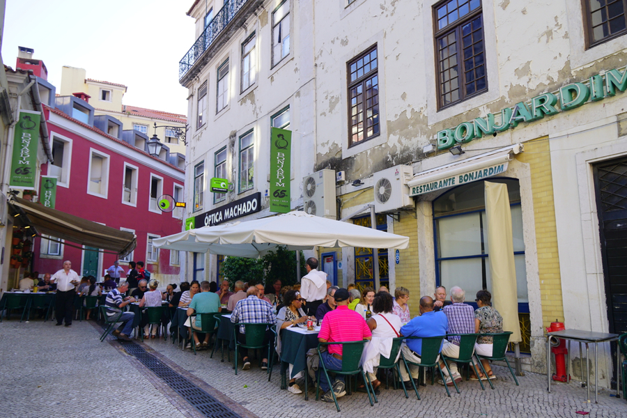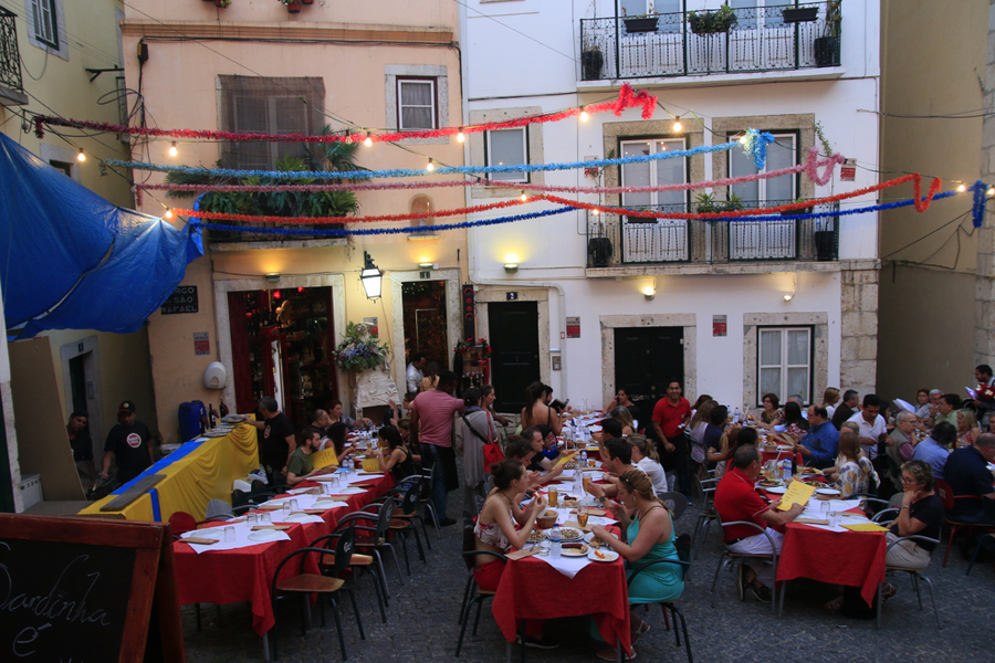 葡国人特别享受吃,午餐也是他们的大餐一般是下午两点以后才开始,还会来两杯红酒(不会影响工作?); 晚上八点后才用晚餐,因为夏天9点后才日落。我们曾经试过下午6点到处找不到营业的餐厅!但是日落时分一旦开始,就不可收拾了:大街小巷都是小餐馆大排档和派对,加上随街飘送的音乐,简直是一片欢乐的海洋!