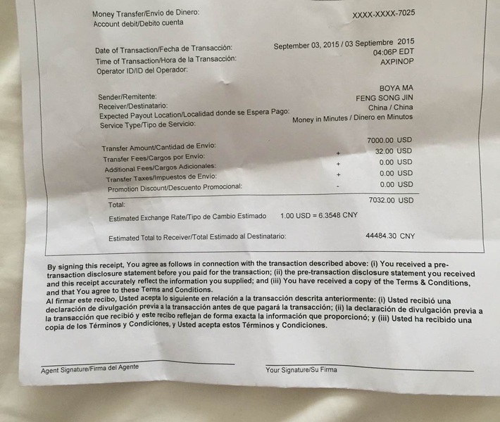 今天下午终于把钱汇到了营口市, 上明下松师父名下。 师父正在去取款的路上。 此次汇款, 共汇7000 美金, 合记人民币 44484.30元, 是西联汇款单天汇款上限了。 共花手续费32美金。 其中, 2095 美金由湾区放生及周边微信群体捐助, 另外5000 左右由马小雅及朋友们捐助。 其中微信群中 捐款由 10 – 400美金不等。 捐款名单包含了142 个回向名字(不愿写名字的佛友用法界众生代替), 142 人中包含了27 名往生 众生, 6位不留名字的法界众生。 每个回向名字都做到了有捐款数额, 根据家人捐款数额平均分配到家人名下, 由 1美金到250 美金不等 。