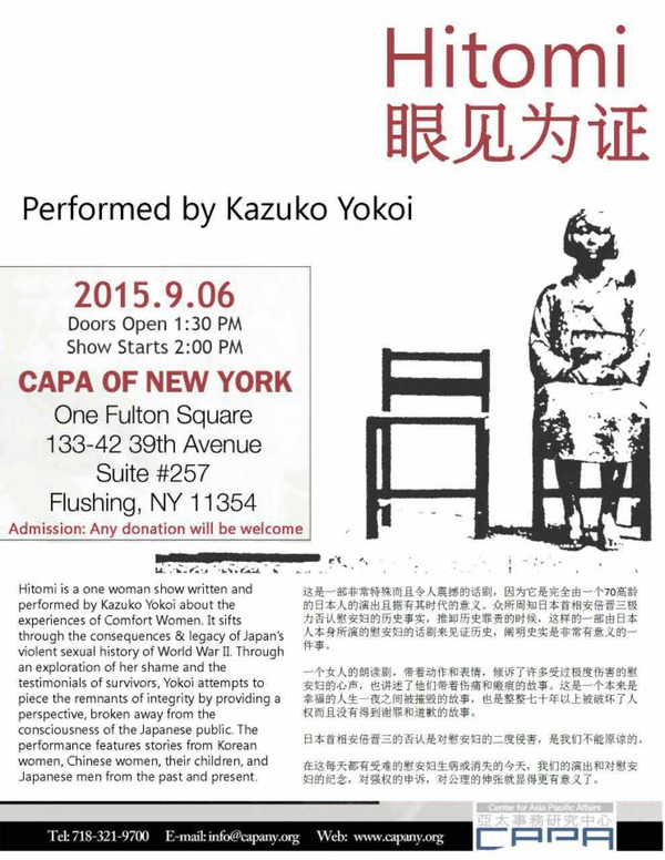 眼見為證由亞太中心主辦,由横井量子獨白, 在舞臺上呈現日軍二戰期間對 女性(慰安婦)的暴行。