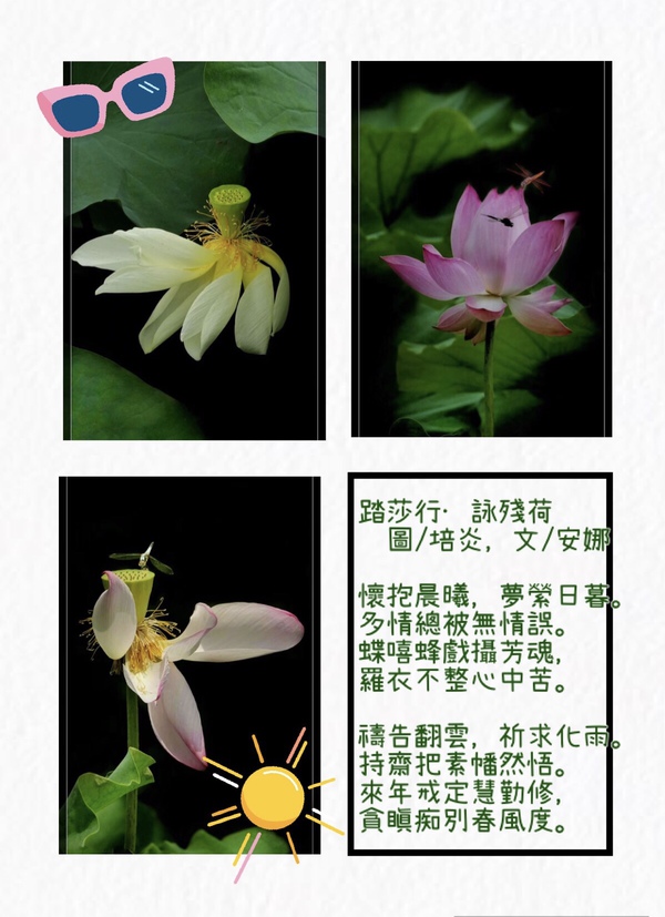 微信發文利器WeiDBcom,點這裡開始!👉👉 踏莎行·詠殘荷 🌟摄影天地 🌟吟詩作對 🌟随笔感悟 Anna-101370 07/19 38680 4.5/2 圖/培炎及網路 文/安娜南瀛吟社七月社課:以「心生歡喜」为主題,題目自擬,絕句、律句、詞均可。(弄潮兒佈題)踏莎行·詠殘荷 懷抱晨曦,夢縈日暮。多情總被無情誤。蝶嘻蜂戲攝芳魂,羅衣不整心中苦。禱告翻雲,祈求化雨。持齋把素幡然悟。來年戒定慧勤修,貪瞋痴別春風度。 微信發文利器WeiDBcom,點這裡開始!👉👉 http://www.weidb.co/p254563 获取作者更多文章 上一页 下一页 51. 謝爾蓋耶夫小鎮(31528) 52. 莫斯科紅場印象(27065) 53. 嘉芙蓮夏宮/你好,莫斯科!(26895) 54. 瓦西里島(25143) 55. 遊聖彼得堡有感(27756) 56. 七律·詠雀兒/30首蘇聯老歌串燒(34542) 57. 宜蘭印象(32324) 58. 台灣淡水一日遊(25136) 59. 如夢令·詠攝友佳作(21797) 60. 憶江南·詠蜻蜓(24673) 61. 七律·詠攝友圖(27837) 62. 西江月 / 寄語(34683) 63. 詩與歌的邂逅/七律·吟攝友圖(25332) 64. 卜算子/更漏子(23606) 65. 喝火令/虞美人·吟攝友照(22699) 66. 落日餘暉渡頭村(25111) 67. 七律二首(19782) 68. 古巷裡被歲月吃掉的磚牆/殘牆/天淨沙(21958) 69. 七律·無題 / 鏡頭下的鳶尾花(27359) 70. 肥哥天地•MIT银桶(60522) 71. 春天 / 一七令·題涂帆照 (27989) 72. 一七令·詩 / 南歌子·詠攝友圖(28842) 73. 喝火令·吟攝友圖 / 七律·詠海棠(26871) 74. 一七令·詠花展(19086) 75. 靑玉案·吟元宵/五律·詠桃花(22275) 76. 卜算子·題攝友圖(26636) 77. 五律·詠西湖景/阮郎歸(25889) 78. 更漏子·題攝友圖(25525) 79. 臨江仙·題攝友圖(23525) 80. 漁家傲·詠慰安婦銅像/七律·詠銀杏二首(22217) 81. 一縷芬芳(20106) 82. 冬夜的雨(20962) 83. 賞花贈詩友(21485) 84. 未知名的角色(23607) 85. 故都的秋(20815) 86. 題沈君行攝 圖/培炎 文/安娜(21662) 87. 老樹絮語 圖/立平 文/安娜(19265) 88. 秋冬吟 圖/培炎 文/安娜(19121) 89. 五律·重陽念母(外二首)(24600) 90. 瀟湘神二首(19052) 91. 漁家傲·題淡君秋色圖 (19186) 92. 夏威夷印象:1. 火山岩浆入海(46450) 93. 五律·詠荷(19136) 94. 昭君怨 ·空中情結(19150) 95. 倚闌令·題沈君西行攝圖 (18386) 96. 點櫻桃◇題諸友圖 (18681) 97. 天仙子 ◇ 詠蓮 (19309) 98. 何滿子·神遊故里(17583) 99. 蝶戀花·心債(17889) 100. 冉冉云·鐵蟲西去(18238) 上一页 下一页