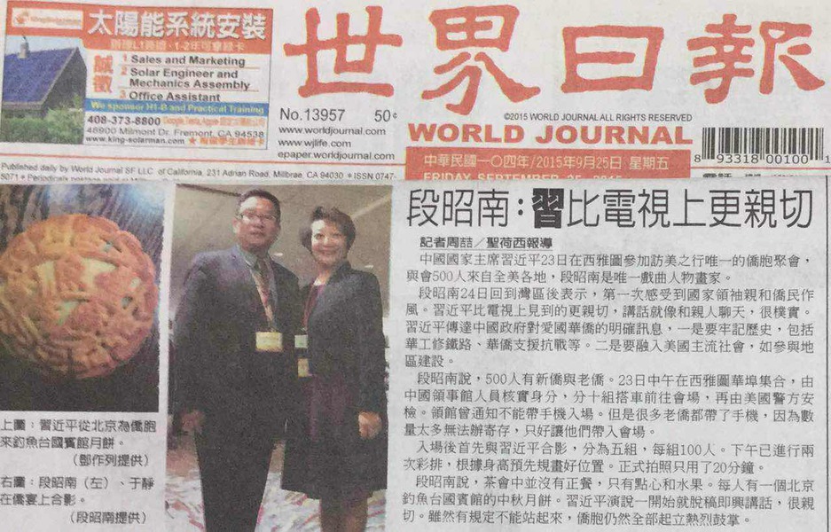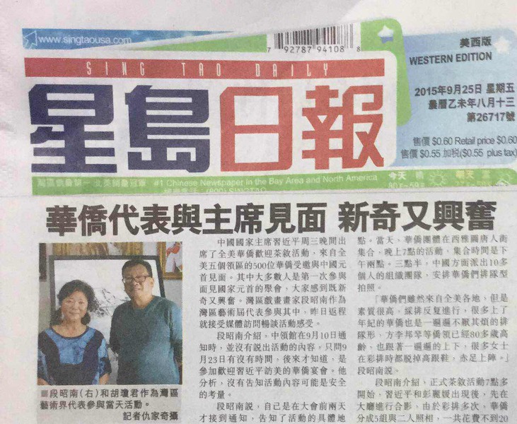 参加此次盛会的华侨来自美国各个地区,是各个专业的代表性人物,段昭南先生在活动结束回到饭店时接受了《星岛日报》的电话采访。这是中国戏剧人物画画家唯一一位接受国家领袖的接见,也是对他60年的“戏画”藝術创作的肯定。自2011年“段昭南戏画”应邀回归展览至今已经完成了十个博物馆、艺术馆的个人展览,也为展览创作了近千幅的剧目画作。300幅作品《洛神》、《秦琼卖马》、《红娘》、《徐策跑城》被博物馆收藏。也在淮安市、徐州市建立了《段昭南戏画艺术馆》。
