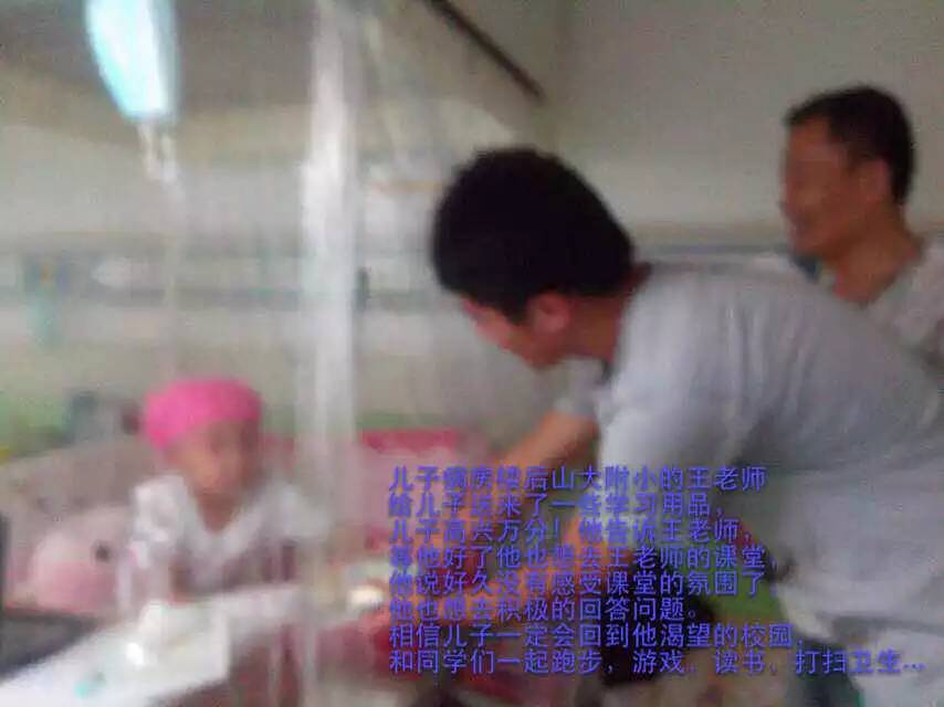 儿子病房楼后山大附小的王老师给儿子送来了一些学习用品,儿子高兴万分!他告诉王老师,等他好了他也想去王老师的课堂,他说好久没有感受课堂的氛围了,他也想去积极的回答问题。相信儿子一定会回到他渴望的校园,和同学们一起跑步,游戏,读书,打扫卫生...