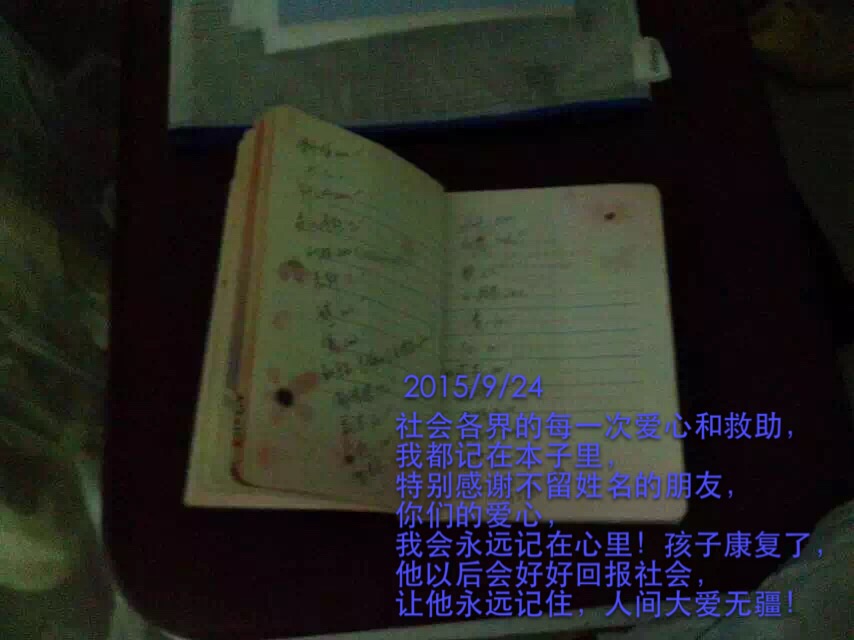 社会各界的每一次爱心和救助,我都记在本子里,特别感谢不留姓名的朋友,你们的爱心,我会永远记在心里!孩子康复了,他以后会好好回报社会,让他永远记住,人间大爱无疆!