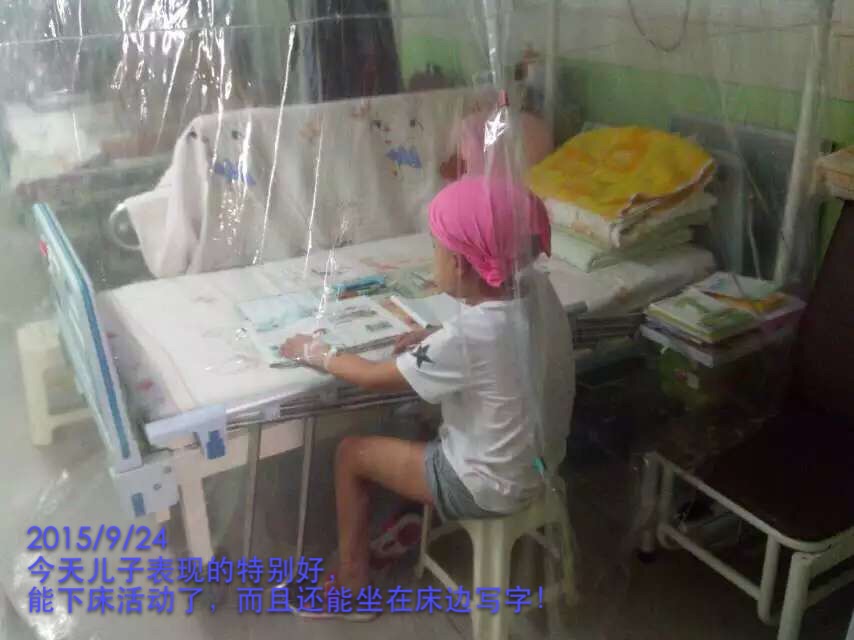 今天儿子表现的特别好,能下床活动了,而且还能坐在床边写字!