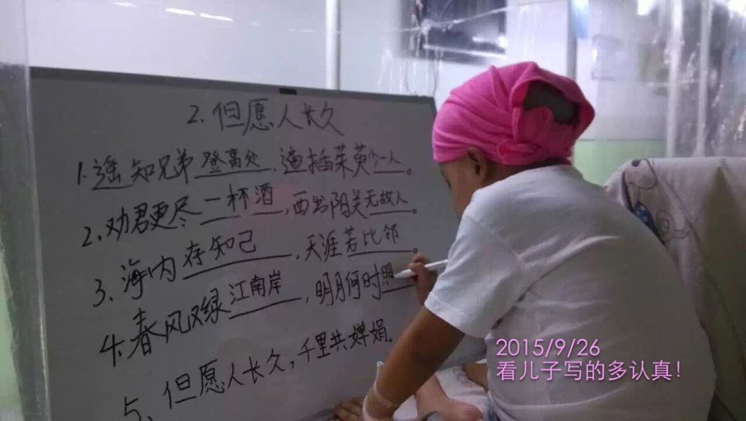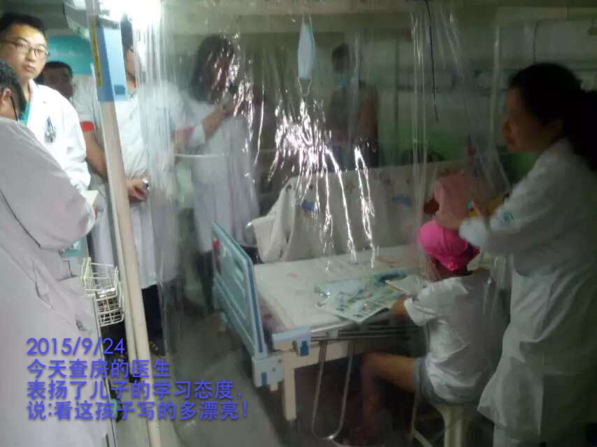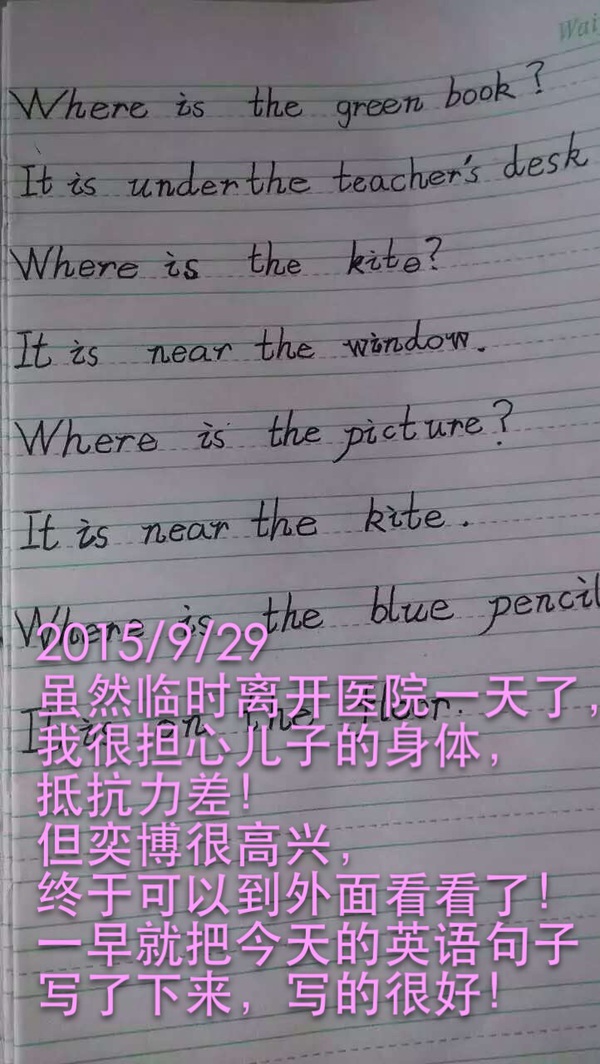 今天查房的医生表扬了儿子的学习态度,说:看这孩子写的多漂亮!