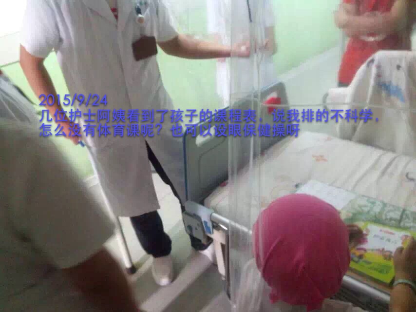 为了让儿子不感到寂寞,在病房里生活的更有规律,我给他设计了一个课程表,让他在没有学习压力的前提下,愉快的学习。儿子高兴极了,但又反问我,怎么不给设体育?听到楼后操场上的吹哨声,儿子羡慕极了!