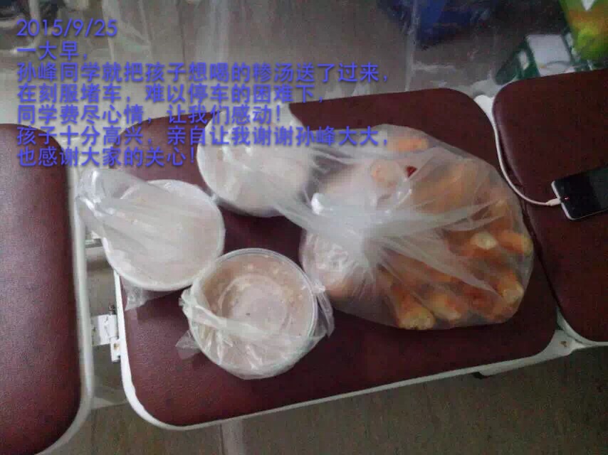 孩子今天状态好些,中午喝了两碗糁汤,饭量增加了,可能是同学们从台儿庄带来的缘故吧,家乡的饭香!