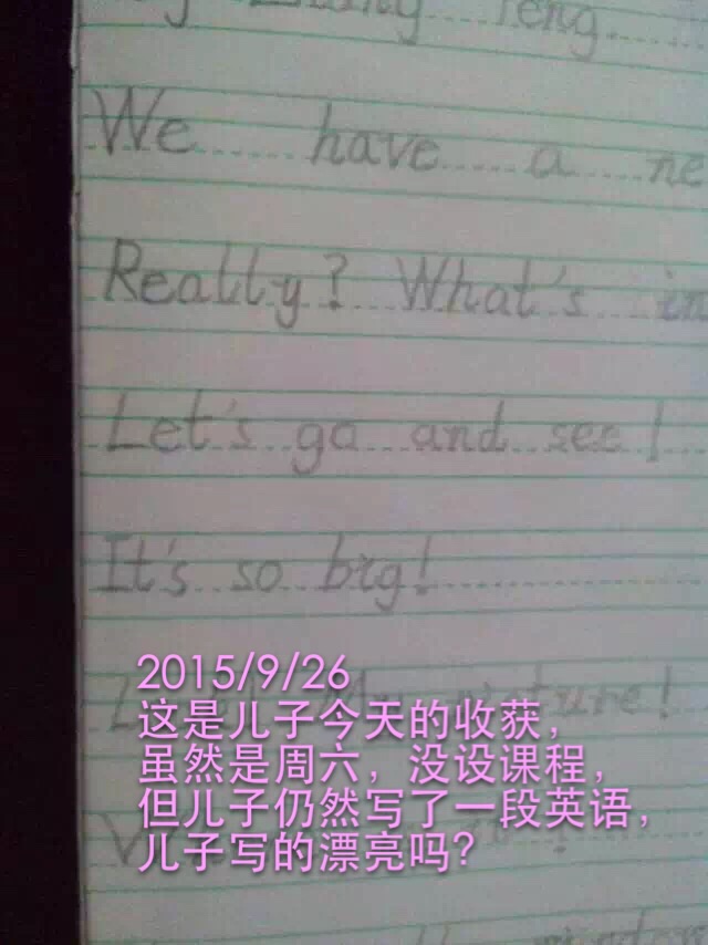 2015/9/26 这是儿子今天的收获,虽然是周六,没设课程,但儿子仍然写了一段英语,儿子写的漂亮吗?