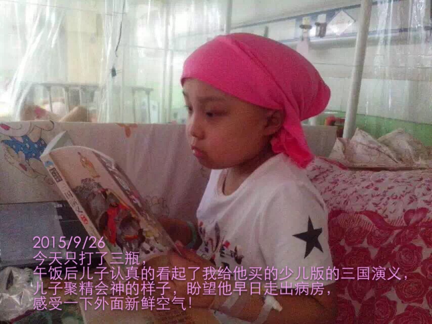 今天只打了三瓶,午饭后儿子认真的看起了我给他买的少儿版的三国演义,儿子聚精会神的样子,盼望他早日走出病房,感受一下外面新鲜空气!