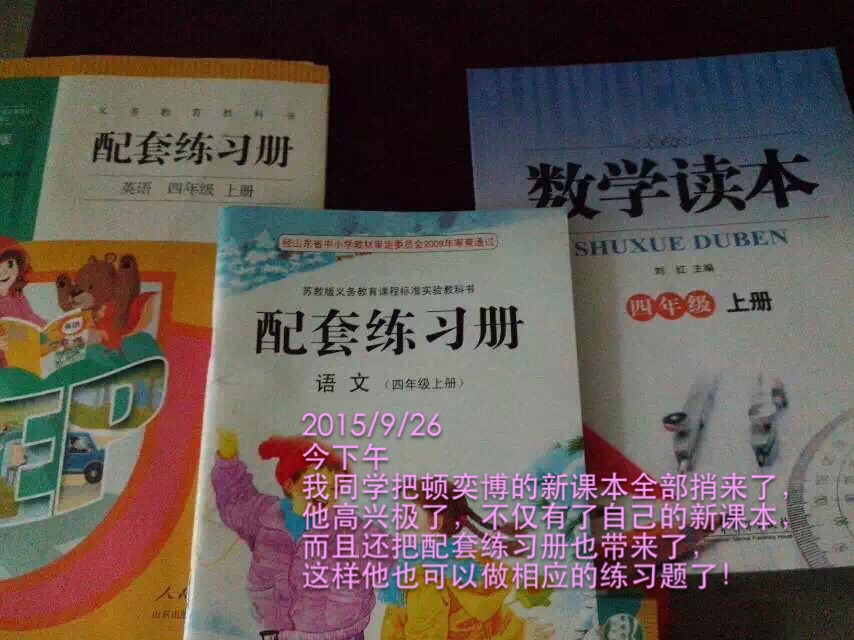 今下午我同学把顿奕博的新课本全部捎来了,他高兴极了,不仅有了自己的新课本,而且还把配套练习册也带来了,这样他也可以做相应的练习题了!