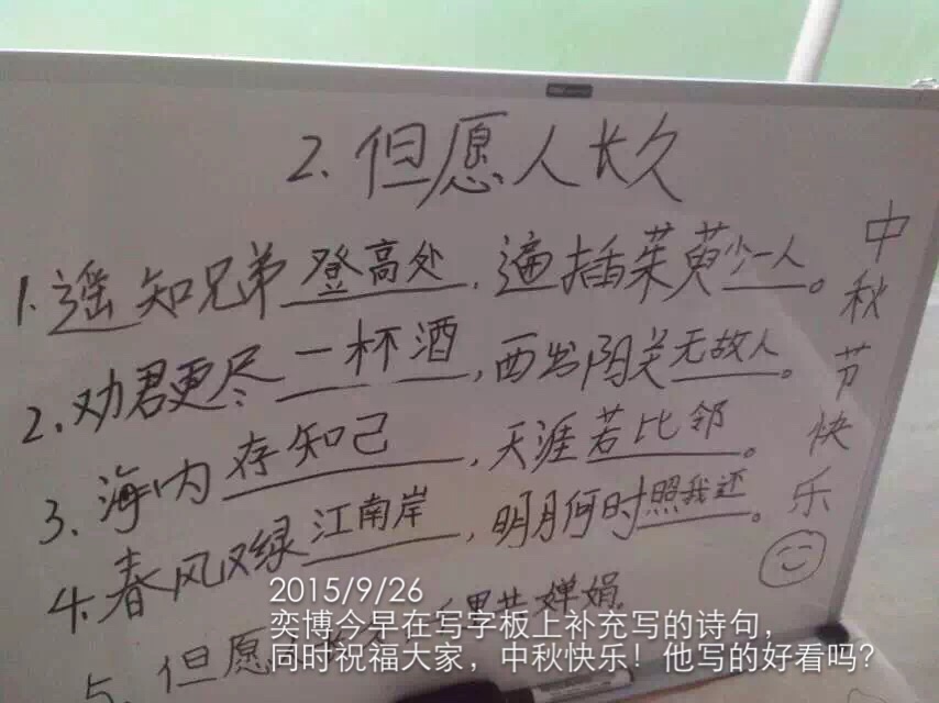 奕博今早在写字板上补充写的诗句,同时祝福大家,中秋快乐!他写的好看吗?