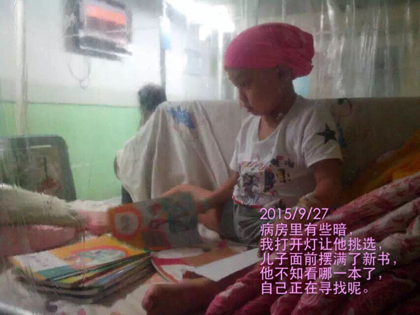 2015/9/27 在这美好的团聚的中秋佳节,我们全家向一直关心,帮助,鼓励我们的同学,朋友,同事,学生,亲友,台儿庄实验小学全体师生,特别是素不相识的社会各界爱心人士,表示我们最诚挚的祝福,祝大家中秋快乐,全家幸福!! 病房里有些暗,我打开灯让他挑选,儿子面前摆满了新书,他不知看哪一本了,自己正在寻找呢。