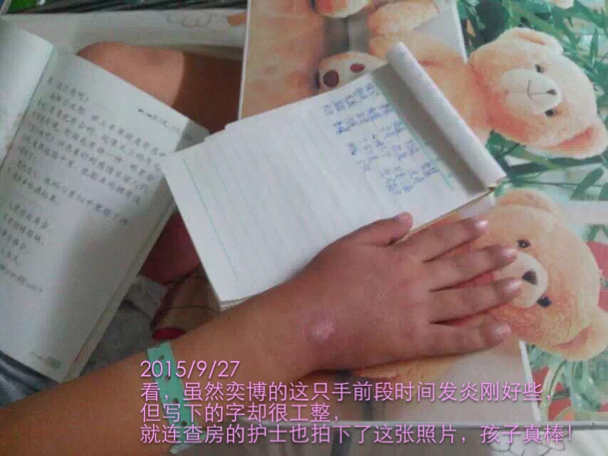 看,虽然奕博的这只手前段时间发炎刚好些,但写下的字却很工整,就连查房的护士也拍下了这张照片,孩子真棒!