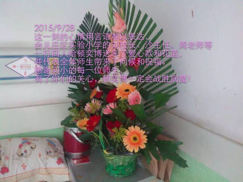 2015/9/28 这一刻的心情用言语难以表达,台儿庄区实验小学的刘校长、沙主任、周老师等一行四人给顿奕博送来了爱心款和花蓝,并代表全体师生带来了问候和祝福。感谢实小的每一位师生,有了你们的关心,顿奕博一定会战胜病魔! 刘校长带来了一套笔尖上的国学,写方正汉字,诵经典国学。让顿奕博爱不释手,他表示一定能全部会诵读!
