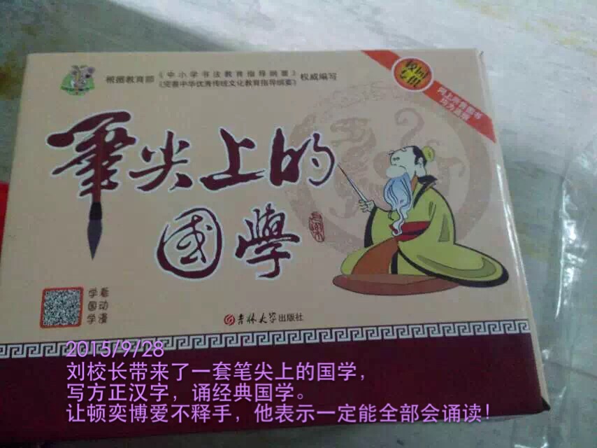 刘校长带来了一套笔尖上的国学,写方正汉字,诵经典国学。让顿奕博爱不释手,他表示一定能全部会诵读!