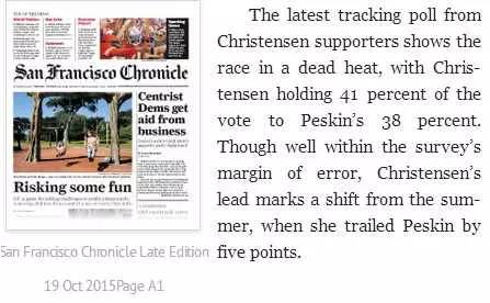 庆幸华人渐已觉醒。最新消息:冀芷欣不负众望,迎头赶上。今天选民调查得出结果,冀芷欣比对手领先5点!据2015年10月18日【三藩市纪事报】报道,不算第三名候选人彭德慧的点数,Julie Christensen 以 42:38 领先Peskin,扭转暑假开始时的 24:29的劣势。