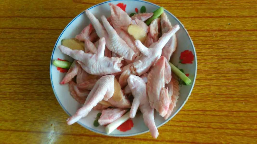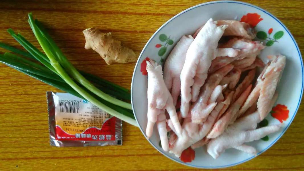 ①:清水洗净食材备用。凤爪去尖尖再中间剖开,姜切片,葱白切断余下切成葱花。