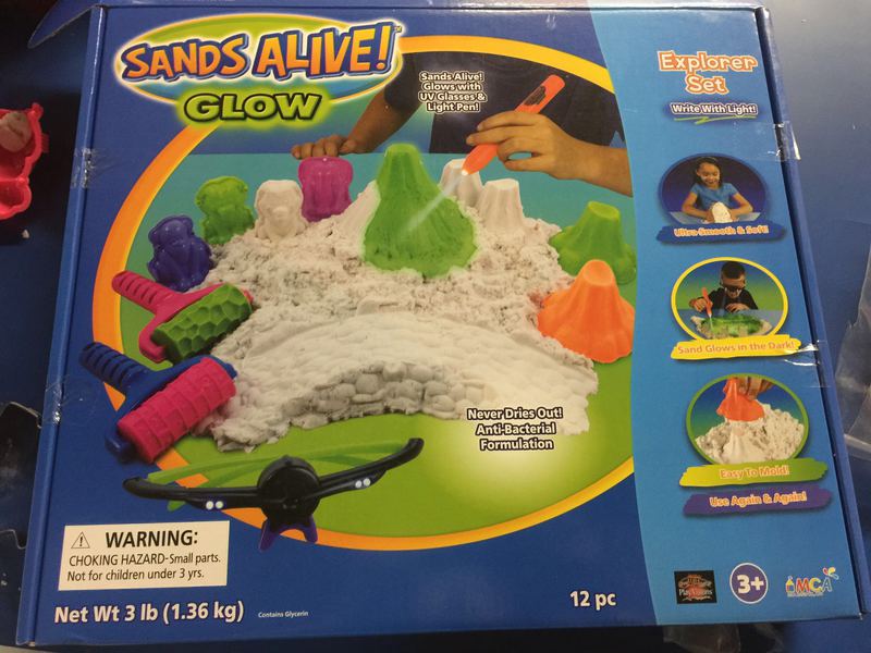 这一款玩具还有一个功能,就是带一个紫外线手电。在暗室里面找过紫外线灯的沙子可以发出绿光。