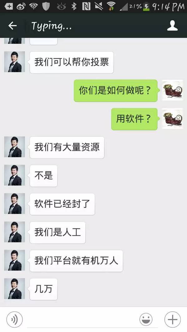 投票的最后一天,几乎是白热化地竞争。洲际的票数一路上升,超过第二名5000票。这时,又有一个人加我。他对我说“5000票是小意思。后边的人想超就超。最后一个小时才见分晓。你让我来操作,保你第一。”原来又是一个票贩子。