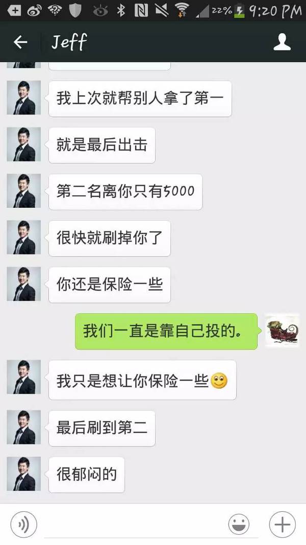 我进入“排行榜公益投票群”之后,每天固定时间发红包拉票。不久就有一个人加了我。他说“ 我可以保证你得第一名。你现在这样拉票太累。我们都是最后时刻出手。”原来这是一个票贩子。我和祝捷的观点一致:坚决不找投票公司刷票。不过票贩子的话也给我们敲了警钟。要想拿冠军,必须把票数拉的高高的,不给对手可乘之机。