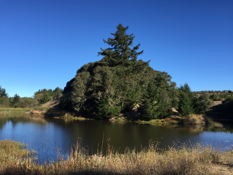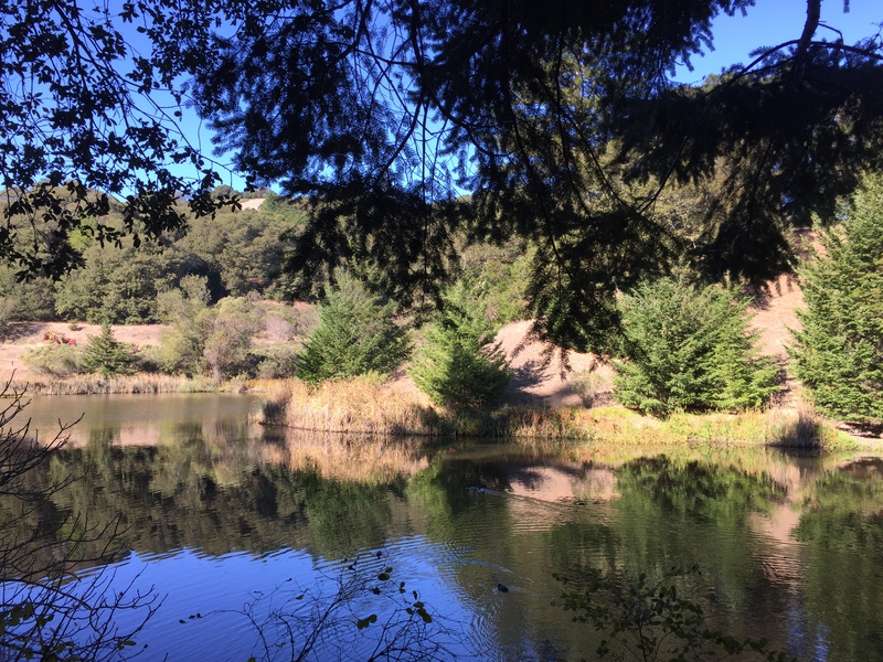 此次远足的地点是Skyline Ridge Open Space Preserve ,这是一个占地两千多英亩的野生公园,最可贵的是,这里竟然拥有两个天然湖泊。湖虽然不大,可是在硅谷这个严重干旱的沙漠之地,水被赋予了灵性,它似乎被套上了光环,看到水,人们立刻两眼放光,精神抖擞。第一个走进我们视野的是一个马蹄形状的湖,湖中心的小岛上郁郁葱葱,几只野鸭子不时地贴着水面相互追逐嬉戏,将平静的湖面搅动得生动起来。我旁边的一个女孩子说了一句:水不清。我忙回了一句:这是硅谷耶,有水就不错了。大家忙着附和,有水的地方就是仙境了。